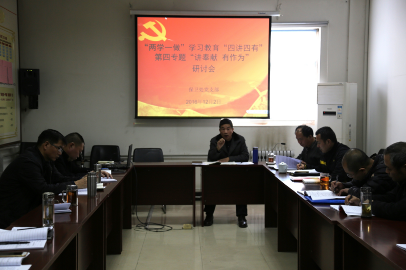 根据学校党委“两学一做”实施方案精神和机关党委具体要求,结合工作实际,12月2日上午,保卫处党支部在二层会议室召开了“两学一做”学习教育“四讲四有”第四专题“讲奉献、有作为”学习研讨会,会议由支部书记任所财主持,保卫处党支部全体党员参加。