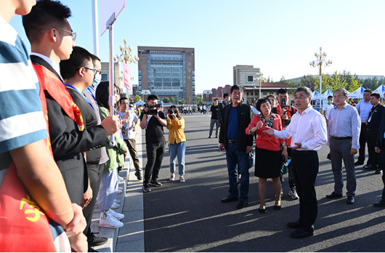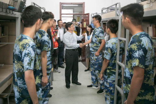 郑强逐一来到各个迎新点,与新生、迎新志愿者和工作人员握手、合影,亲切交谈并热情拥抱。在学生活动中心,郑强饶有兴趣地欣赏了军乐队的表演,为乐队提出了中肯的意见和建议。在饮食服务中心迎新服务点,郑强驻足观看了拉面表演,并在餐厅师傅制作的面气球上写下“太原理工 美食家园”几个大字;在“相聚太理、暖心为你”的地图墙前,郑强郑重插上标志太原理工大学的小红旗;在新生宿舍,郑强仔细询问新生“是哪里人?”“学什么专业?”当得知有同学来自重庆,郑强即刻亲切地用方言与老乡交流,并鼓励新同学要好好学习,特别要学好基础知识,练好“蹲马步”“打沙袋”“举石锁”等基本功,为今后的发展奠定扎实根基。走出宿舍,郑强一行又来到田径场看望已经开始军训的新同学和教官,叮嘱大家要好好训练,认真完成军训任务。他嘱咐教官,大学生都是最优秀的青年,军训中既要严格训练,同时也要进行红色传统文化教育。通过直播平台,郑强告诉广大家长朋友们,您的孩子到了理工大学就是我们的孩子,我们爱孩子们,不仅要把孩子们教育好,还要让孩子们向着更高层次的目标迈进。