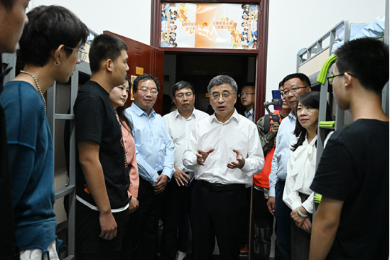 此前正在外出差的黄庆学校长一下火车就直奔迎新一线,与志愿者和工作人员亲切交流、合影留念。“赠人玫瑰,手有余香。”黄庆学高度赞扬志愿者们助人为乐的精神,并感谢大家为学校大家庭做出的积极贡献。当得知有一部分志愿者是提前三天到校的新生时,黄庆学高兴地说,“你们为大家树立了榜样。”走出明向校区南门,黄庆学来到家长中间,一边握着家长的手一边暖心宽慰,“学校的办学理念是以学生为中心,我们会一切为了学生,请家长放心。”黄庆学还通过直播平台向新生和家长介绍了学校的基本情况,鼓励新同学传承优良传统,努力成为国家栋梁。在宗复学院迎新点,作为院长,黄庆学鼓励大家要积极培养创新思想、提高创新能力,努力成长为拔尖创新人才,为全校广大学子做好榜样,带领大家共同为学校“双一流”建设增添力量。来到学生宿舍,黄庆学勉励广大新同学要努力学好基础知识,不怕吃苦,为将来的发展奠定坚实基础。其间,黄庆学还专程看望了因意外失去双臂的研究生王海港同学,称赞他身残志坚,值得广大师生学习。鼓励他好好学习,加强锻炼,有困难和问题随时向老师提出来,并叮嘱相关工作人员要及时给予关心和帮助。