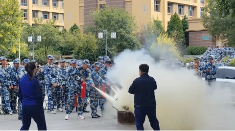 在灭火器的使用体验活动现场,组织部分新生体验使用灭火器,扑灭初起火灾,让新生掌握灭火器“一提”“二拔”“三握”“四压”的实际操作技能。